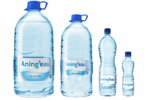 ANING’EAU est une eau de table produite par la Sobraga Port-Gentil, sous licence de la Société des Eaux de Léconi (SOBOLECO, Andza) depuis 2013. Pure et neutre en minéraux, elle répond aux besoins essentiels de toute la famille. ANING’EAU appartient à la catégorie des « eaux de table », elle est donc traitée et assainie pour la rendre meilleure à la consommation, testée, puis embouteillée. Elle est devenue en moins d’une année l’eau préférée des habitants de Port-Gentil ! Le nom « ANING’EAU » est un clin d’œil à la langue omyénè (aningo), dans laquelle il désigne l’eau.